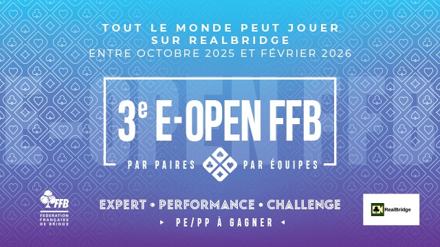 Participez aux 3es E-Open/FFB sur Real Bridge entre octobre 2025 et janvier 2026. Toutes les catégories peuvent jouer : Expert, Performance et Challenge.
