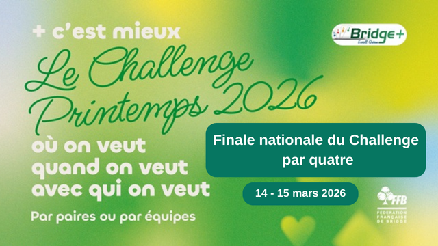 Ce week-end (14-15 mars) c'est la finale nationale du Challenge par quatre. 28 équipes vont s'affronter en 7 matchs de 10 donnes sans mi-temps.