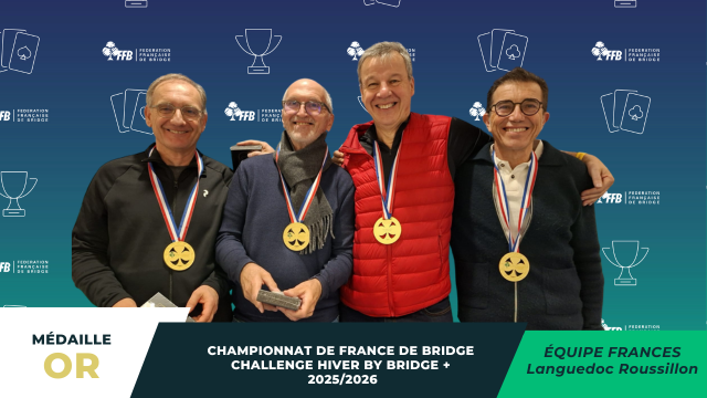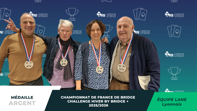 Challenge par 4 by Bridge +, c'était la finale avec 7 matches au total pour départager les 28 équipes venues de toute la France. C'est la formation de Eric Frances du BC Evasion à Saint Gély du Fesc (Languedoc Roussillon) qui remporte le titre.